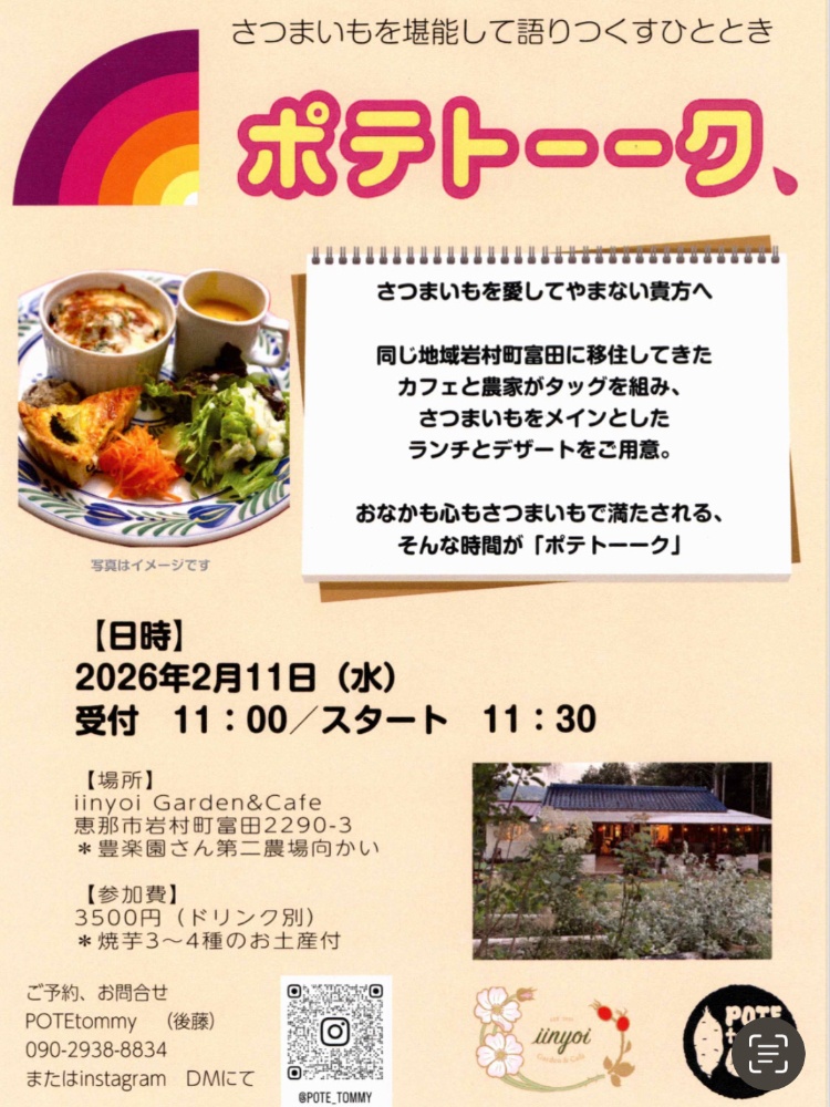 【激闘!120分1本勝負!イモ!芋!オンリー芋!おぢさんロンリーとさつまいもラバー達のガチンコトーク&焼芋食べ比べバトル!】恵那市岩村町の芋しか作らん芋屋POTE tommy栽培した品種と失敗と失恋は数知れずイモに恋焦がれ、イ〜モに泣〜く(GLAYグロリアス風)芋の事しか考えてない芋野郎をついつい中津川に呼んじゃいました。デリシャスで個性豊かな芋の食べ比べとデンジャラスでネットリ系芋トークでおなかもこころもホクホク系。しかもお土産付のクレイジー企画を是非浴びる程ご堪能くださいませ。2025年2月11日14:00~16:00ひと・まちテラス101a参加費:1500円(芋食べ比べ&おみやげ付き)